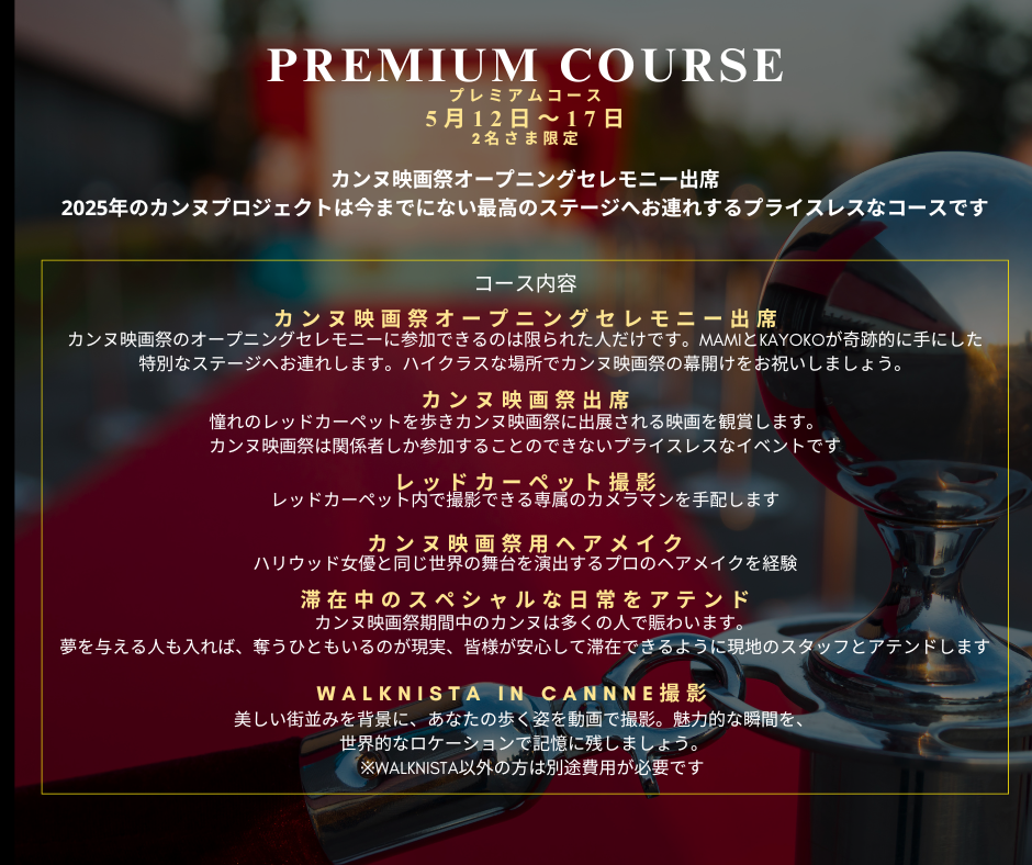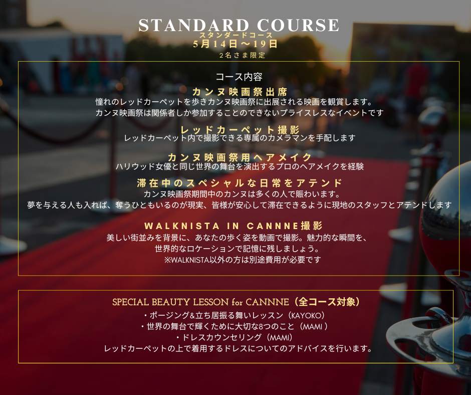 今年はカンヌ映画祭のオープニングセレモニーに参加することが出来るコースを用意しました。この特別な機会にぜひご参加ください。
