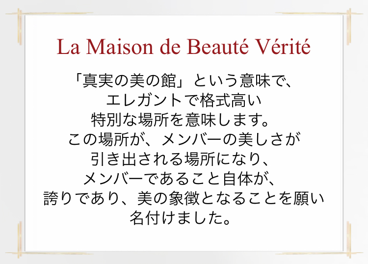 そんなとき、一緒に高めあえる仲間「La Maison de Beauté Vérité」(ラ メゾン ドゥ ボーテ ヴェリテ)のメンバーとともに、「美しく輝く人生」を歩みませんか?