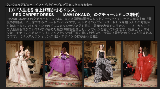 Red carpet dress “MAMI OKANO”が主催する「ランウェイデビュープロジェクト」は、デザイナーMAMI OKANOの手による、一人一人の人生を輝かせ引き上げるドレスを身に纏い、世界のランウェイにデビューするプロジェクトです。