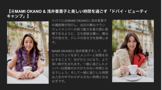7月27日(木)、28日(金)に1泊2日で開催されるビューティキャンプ。MAMI OKANO、浅井香葉子による世界レベルのビューティレッスン、パーティでの社交に不可欠なテーブルマナーレッスンなどをご受講いただきます。(宿泊費、テーブルマナー実践ランチ代を含みます)