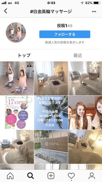 インスタの検索機能を使い、家がある「白金高輪マッサージ」で検索すると、色々でてきました!